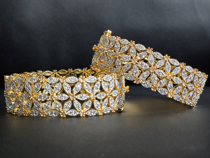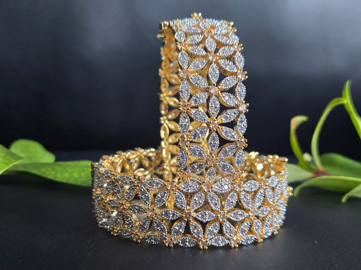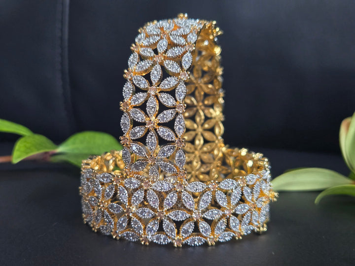 The Elegant Floral Bangle blooms with delicate charm, where golden vines cradle sparkling zircon petals in a garden of brilliance. Each floral motif is carefully crafted to mirror nature’s harmony, radiating grace with every glance.