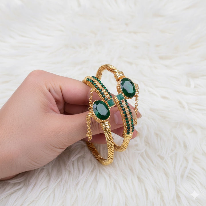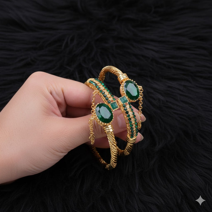 Step into elegance with our kum kum bangles (Green) a stunning fusion of vibrant gemstones and intricate craftsmanship. Adorned with ruby red, and pearl-white stones, this masterpiece reflects the grandeur of traditional artistry while carrying a modern charm. The openable design ensures ease of wear, while the dazzling arrangement of colors makes it the perfect choice for weddings, festive occasions, or any celebration where you wish to sparkle with royal grace.