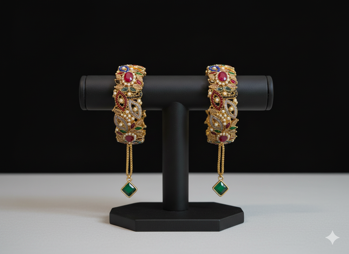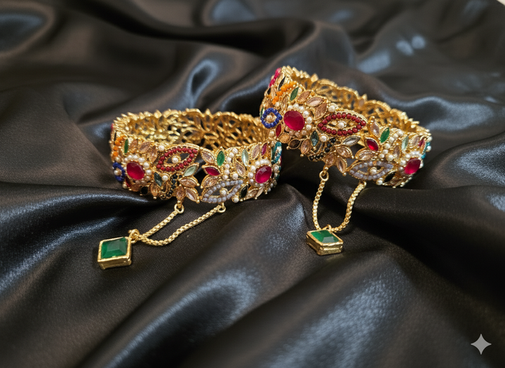 Step into elegance with our Luxury Navaratna Bangle a stunning fusion of vibrant gemstones and intricate craftsmanship. Adorned with sapphire blue, emerald green, ruby red, and pearl-white stones, this masterpiece reflects the grandeur of traditional artistry while carrying a modern charm. The openable design ensures ease of wear, while the dazzling arrangement of colors makes it the perfect choice for weddings, festive occasions, or any celebration where you wish to sparkle with royal grace.