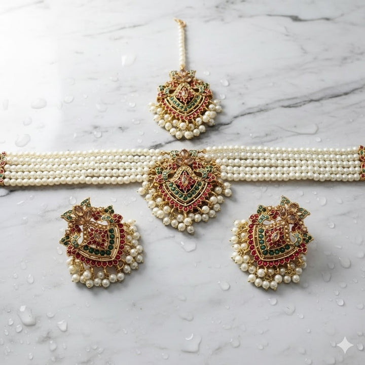 Step into royal elegance with our Maharani Choker Set (Champagne) โ a masterpiece inspired by regal heritage and timeless glamour. This stunning choker set radiates sophistication with its champagne-toned stones, gracefully paired with shimmering pearls and intricate gold plating that capture the essence of royal beauty.