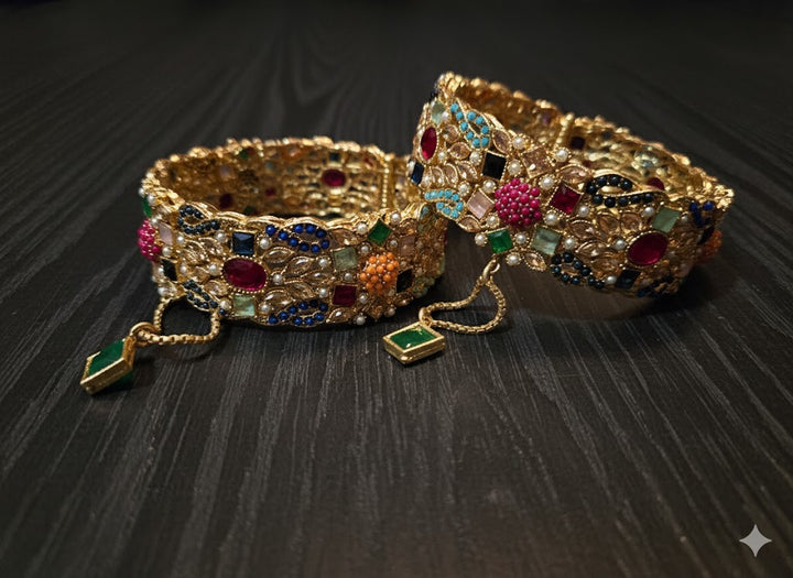 The Navrattan Classic Bangle is a masterpiece that tells the story of timeless beauty. Each stone, from the deep greens to the fiery reds, soft pinks, and ocean blues, comes together like a mosaic of heritage. Set in intricate goldwork, the bangle reflects the charm of royal tradition while carrying a sparkle that feels alive and modern. It’s not just jewelry—it’s a treasure meant to be passed down, a symbol of elegance that never fades.