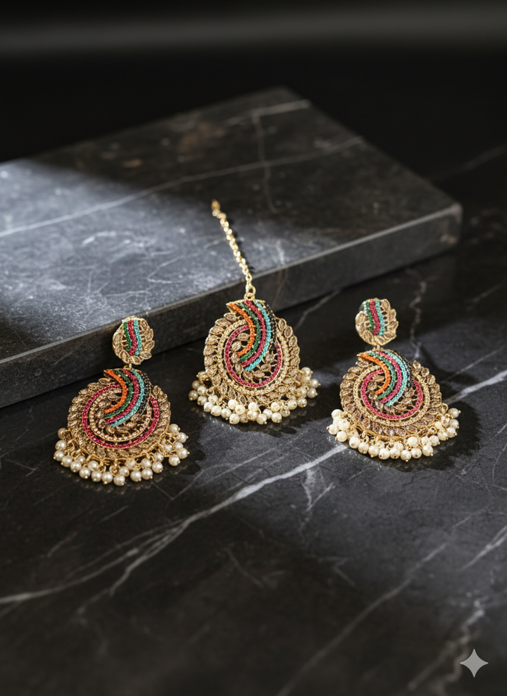 These exquisite earrings and teeka are designed to complement any outfit, adding a touch of sophistication and timeless elegance to your look.