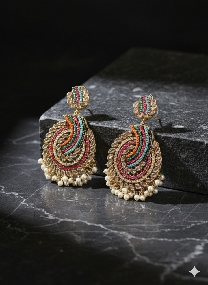• Stones: Champagne, emerald, turquoise, orange crystals, zircon/polki, and pearls on a gold-plated base.