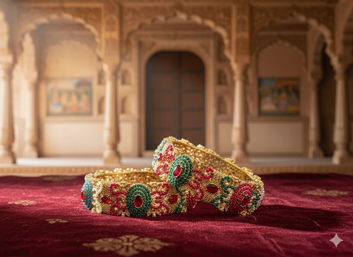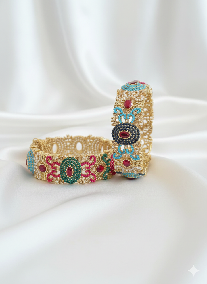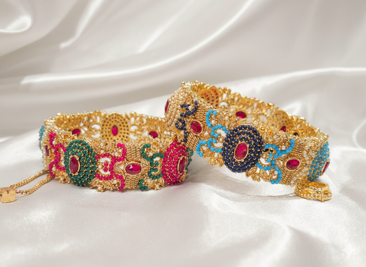 Step into elegance with our Premium Navaratna Bangle a stunning fusion of vibrant gemstones and intricate craftsmanship. Adorned with sapphire blue, emerald green, ruby red, and pearl-white stones, this masterpiece reflects the grandeur of traditional artistry while carrying a modern charm. The openable design ensures ease of wear, while the dazzling arrangement of colors makes it the perfect choice for weddings, festive occasions, or any celebration where you wish to sparkle with royal grace.