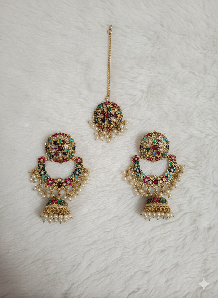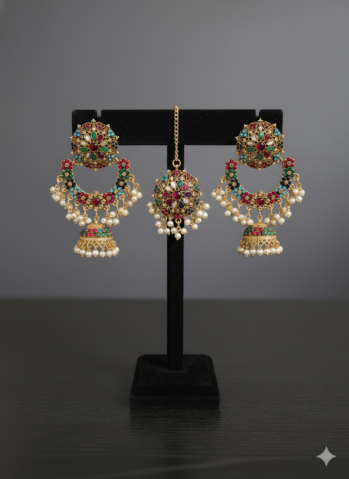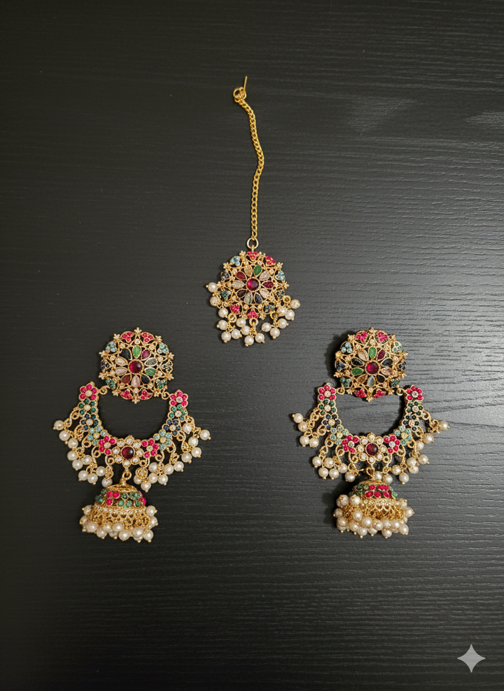The statement jhumka earrings, richly embellished with multicolor stones and delicate pearl drops, pair perfectly with the matching Kundan maang tikka, making it an exquisite choice for weddings, bridal wear, festive occasions, and cultural celebrations.