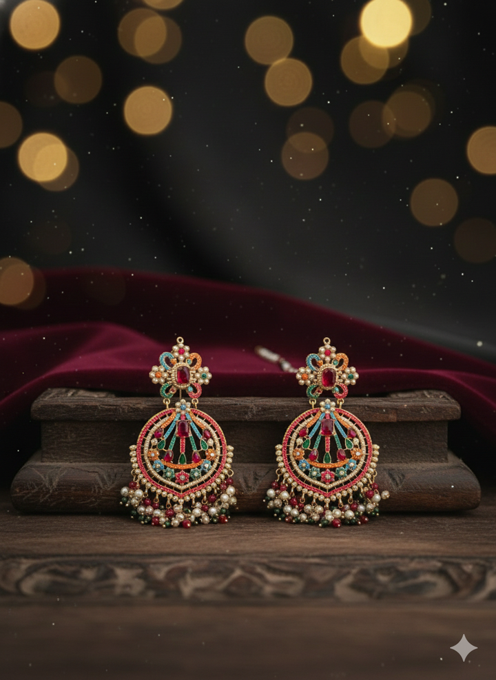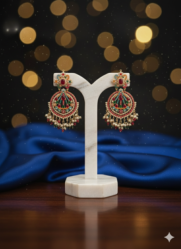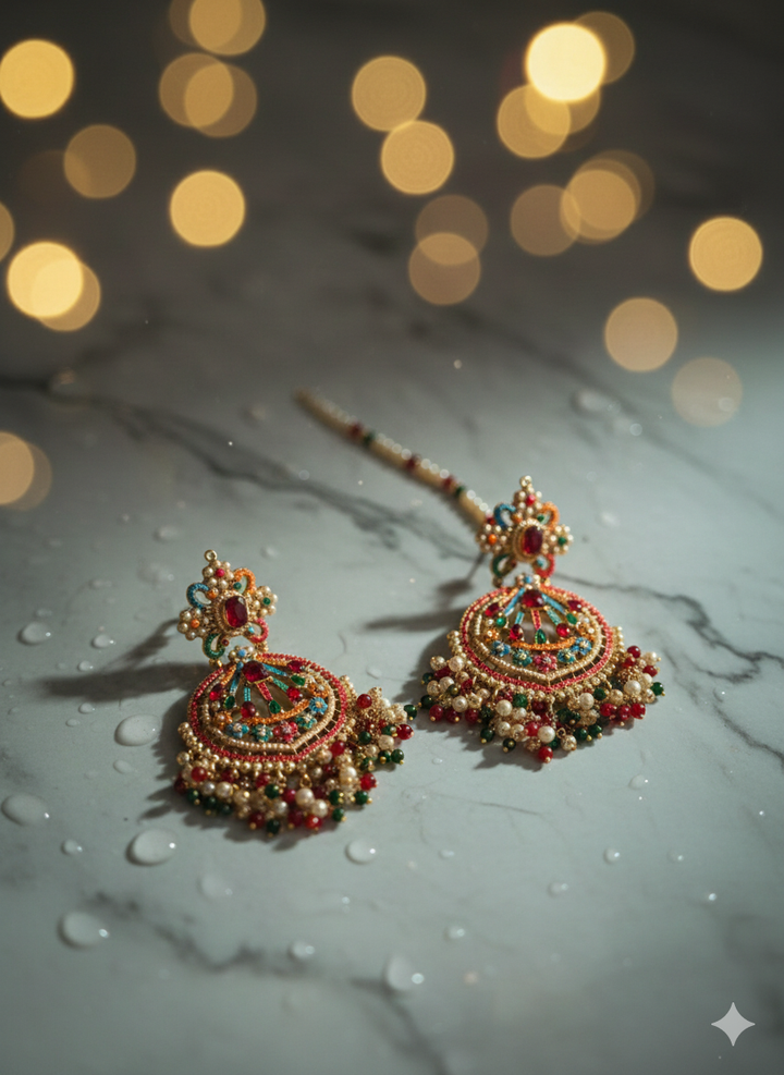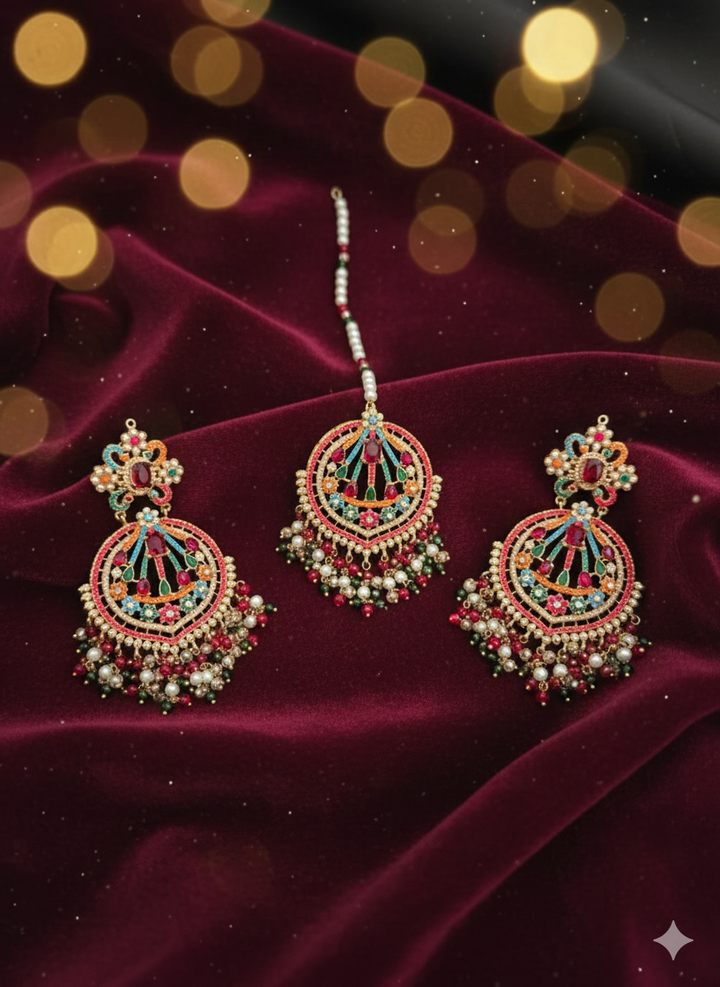 - Design Style: Traditional Navratna Peacock Chandelier Jhumka with Oversized Maang Tikka